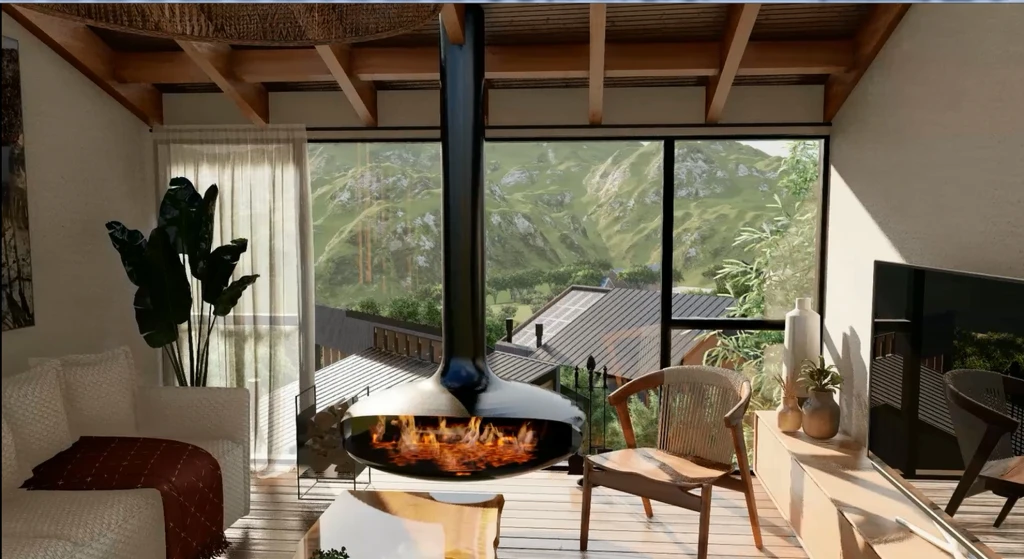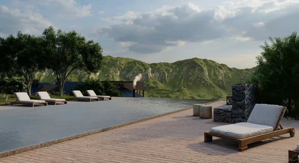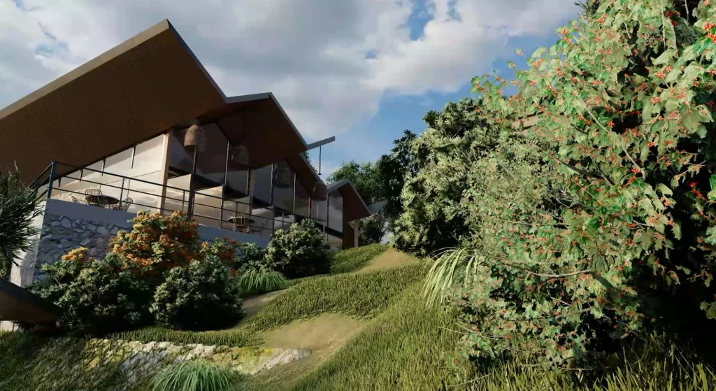 El conjunto se compone de 16 cabañas, todas singulares y adaptadas minuciosamente a la topografía inmediata. Su estructura combina un zócalo de piedra en sistema húmedo, que consolida el arraigo al terreno, y una planta alta en sistema seco, que resulta liviana, altamente eficiente y está orientada a maximizar las vistas. Esta estrategia busca reducir el impacto de la construcción, acelerar los tiempos de ejecución y elevar el confort térmico y acústico. La infraestructura se complementa con un Salón de Usos Múltiples (SUM) que goza de vistas privilegiadas, áreas de piscina y solárium, una administración completa y un quincho. En total, el proyecto contempla 1.940 m2 cubiertos, además de cocheras y espacios exteriores plenamente integrados al entorno natural. El complejo incorpora sistemas de energía solar y aerotermia, tratamiento independiente de aguas negras y grises, captación de agua de lluvia y espacios controlados para el fuego, reforzando así un enfoque de baja huella ambiental.
